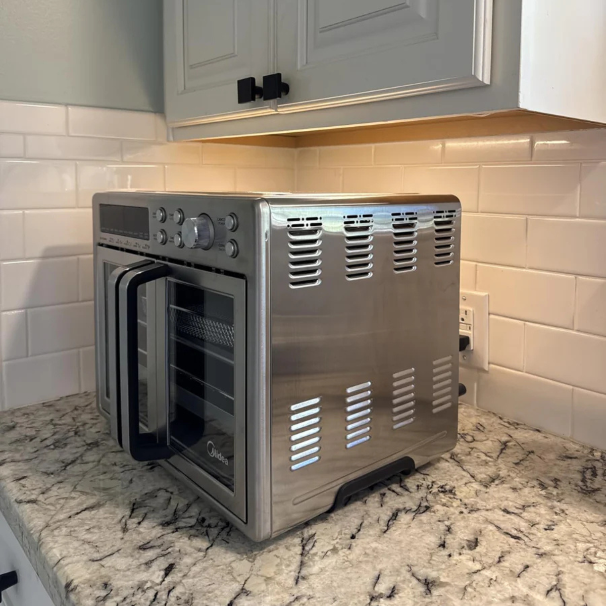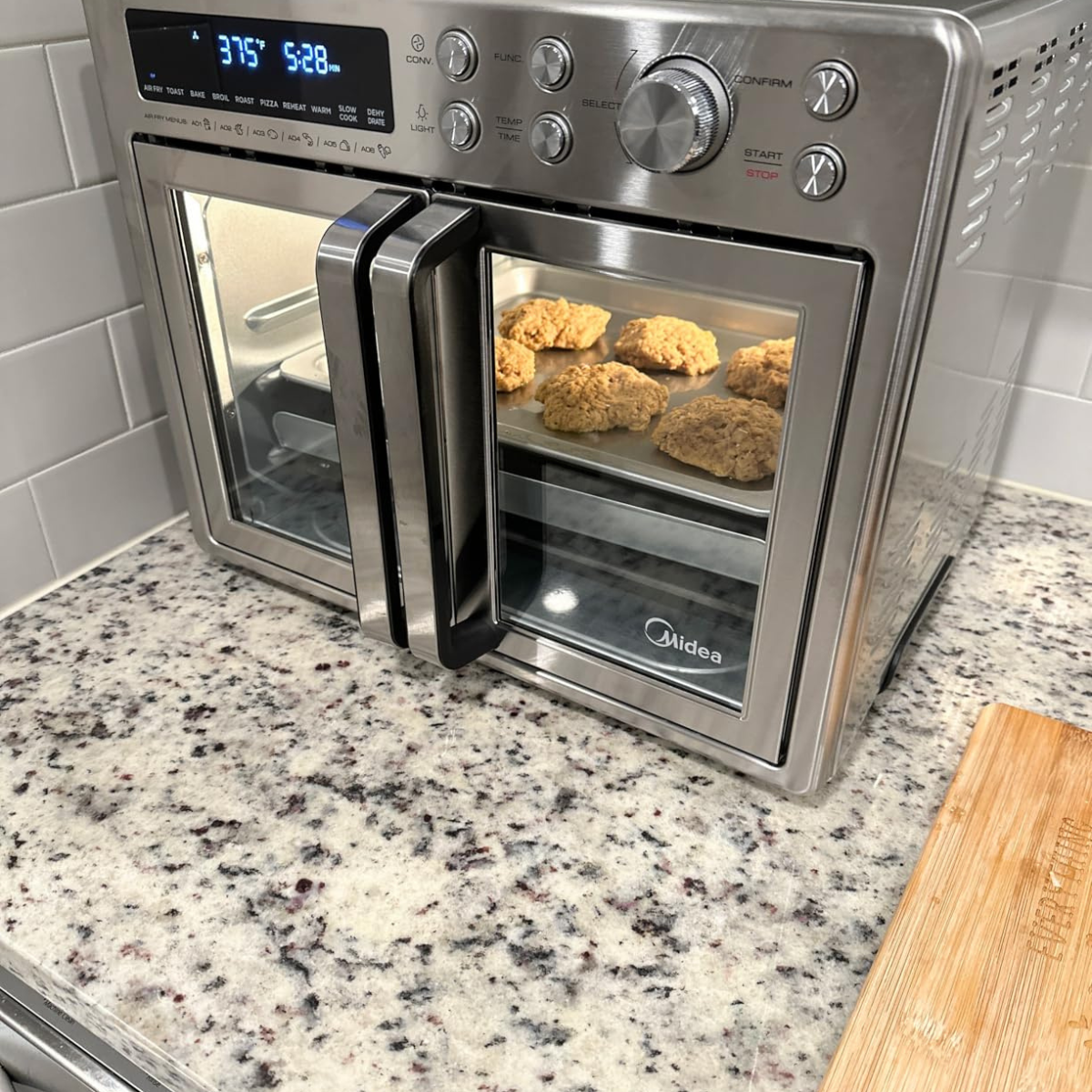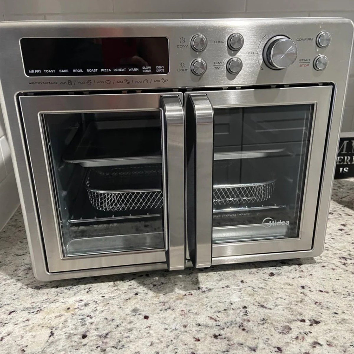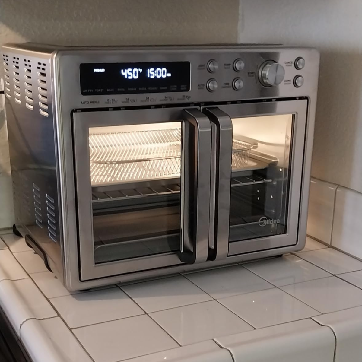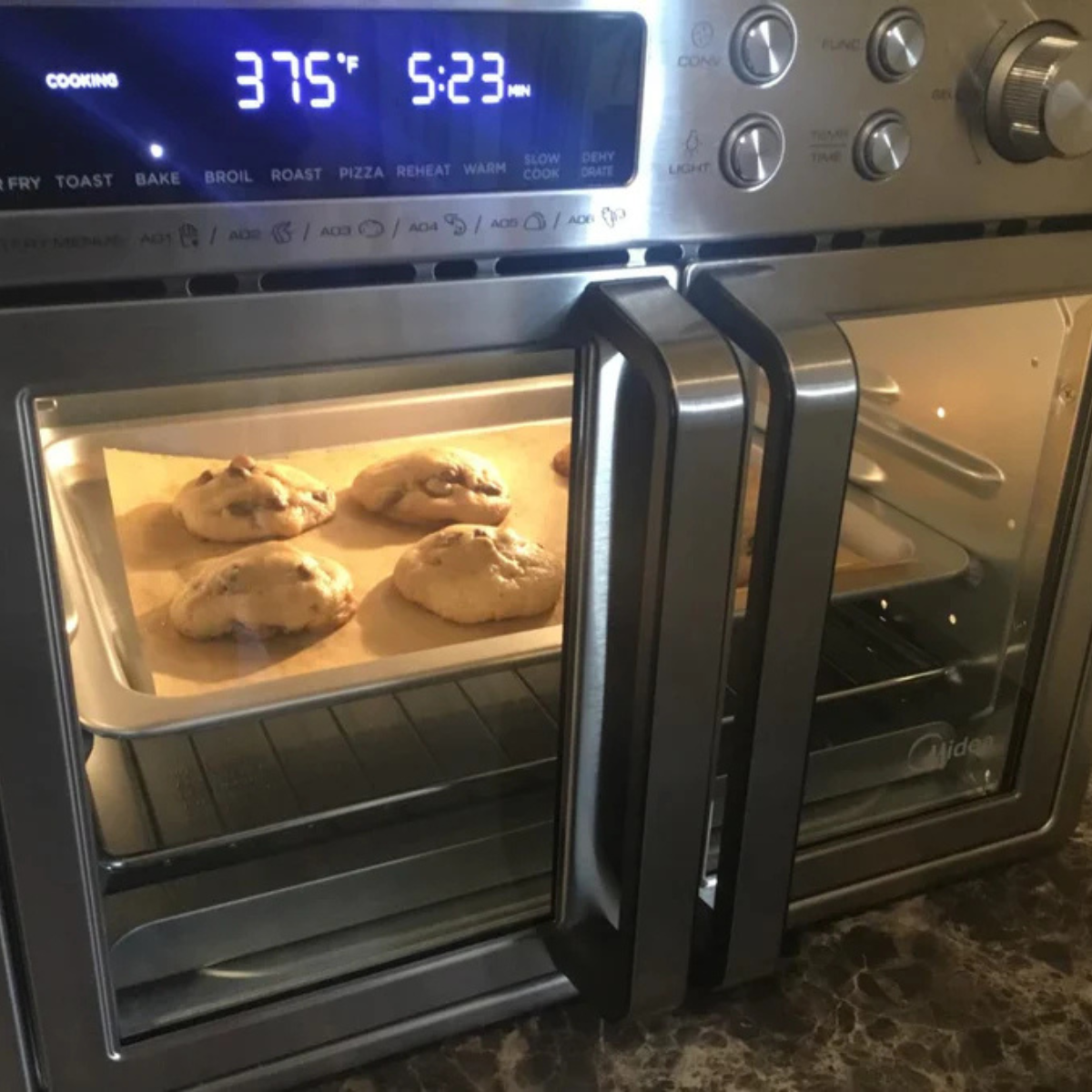 Con un simple giro de la perilla, podés recorrer sus modos —Air Fry, Bake, Roast, Toast, Broil, Reheat y más— mientras la pantalla muestra al instante los grados exactos, el tiempo restante y todos los ajustes activos.