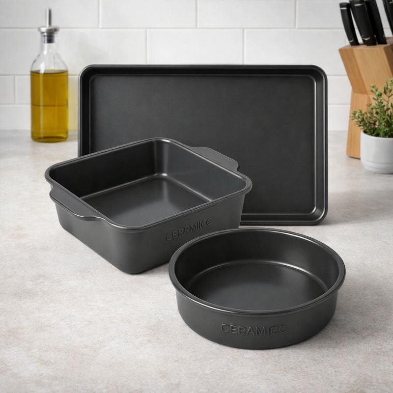 Incluye charola rectangular, molde redondo y molde cuadrado —todo con recubrimiento cerámico antiadherente para hornear, gratinar, rostizar y preparar postres sin esfuerzo.