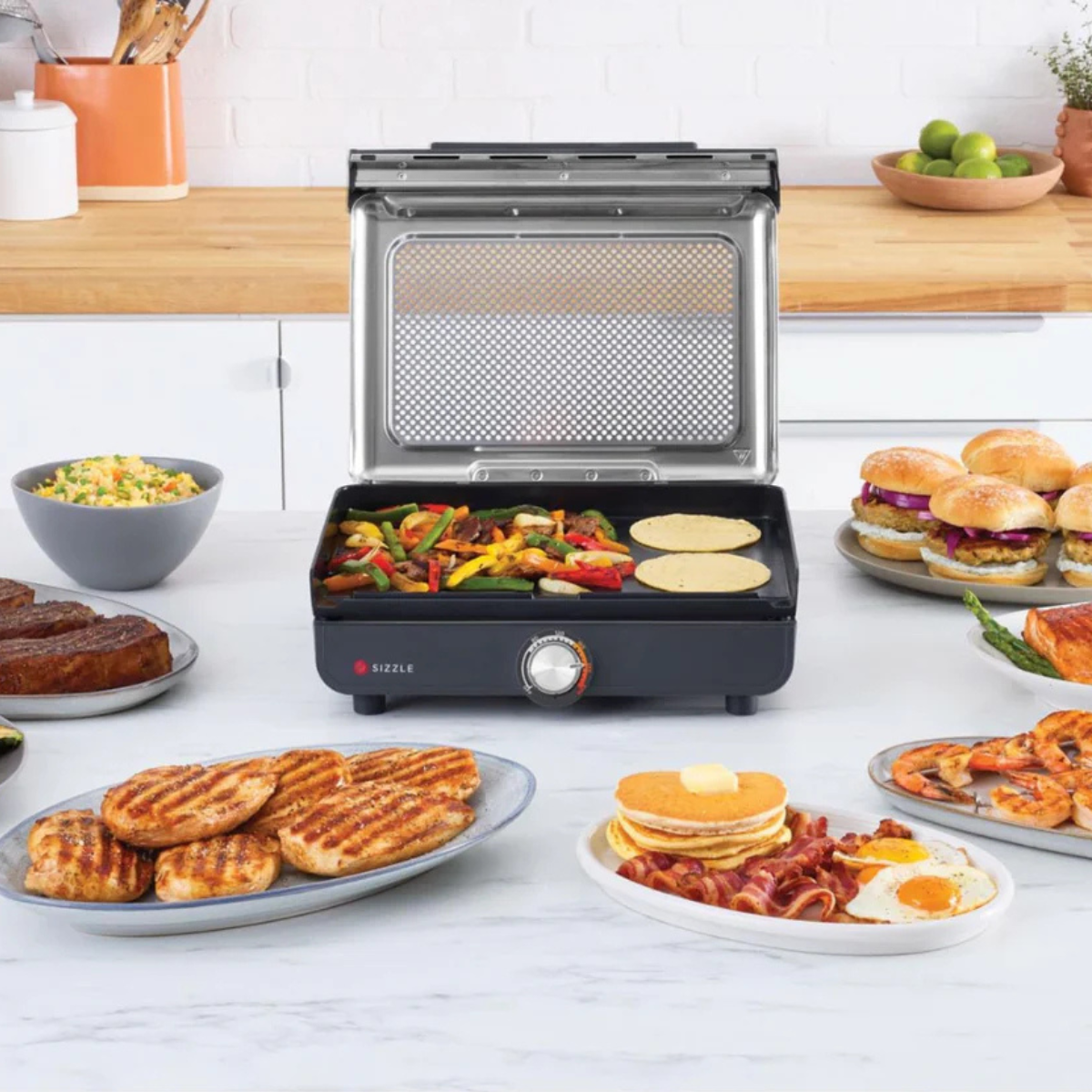 Prepara desde hamburguesas jugosas y pollo perfectamente marcado, hasta vegetales salteados, pancakes, bacon crujiente y sándwiches tostados… todo en un mismo equipo y sin salir de tu cocina.