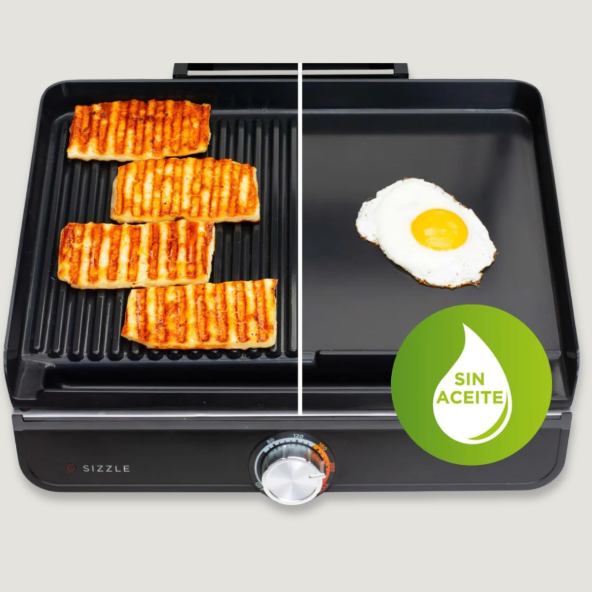 La parrilla alcanza temperatura alta en pocos minutos y cocina más rápido que una sartén tradicional gracias a su calor parejo y estable, ideal para carnes, desayunos, sándwiches y vegetales.