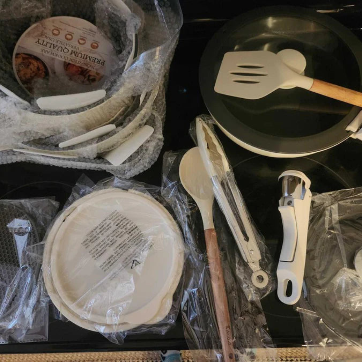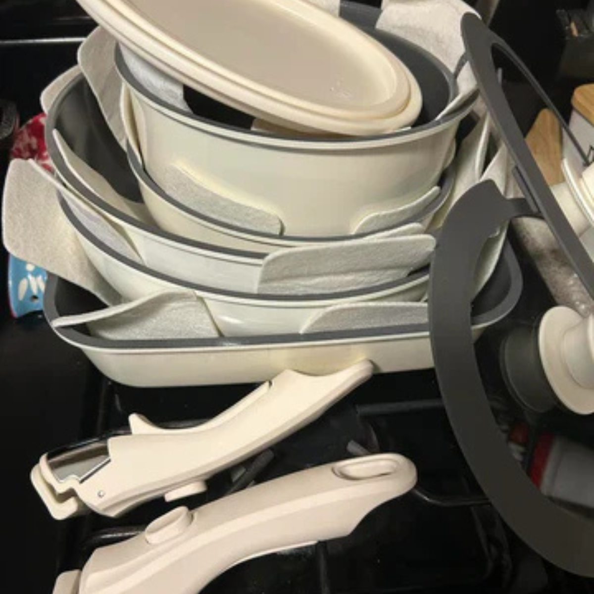 Sí. El set incluye protectores de tela y bases de silicón que evitan rayaduras al apilar las piezas. Así puedes ahorrar hasta un 70 % de espacio en tu cocina sin dañar el recubrimiento.