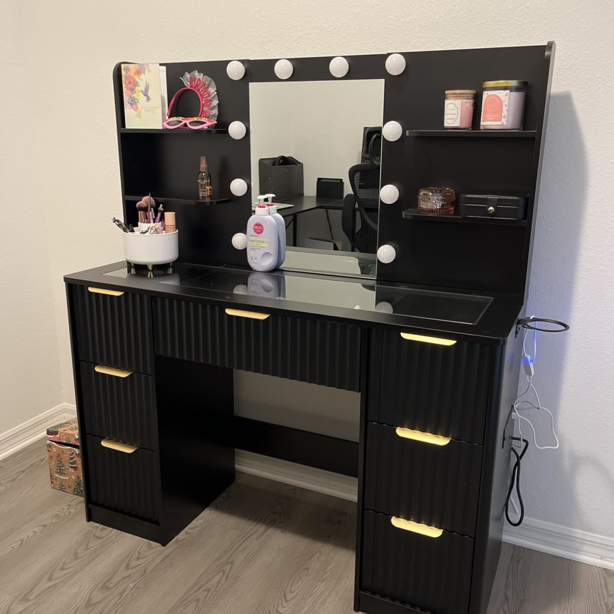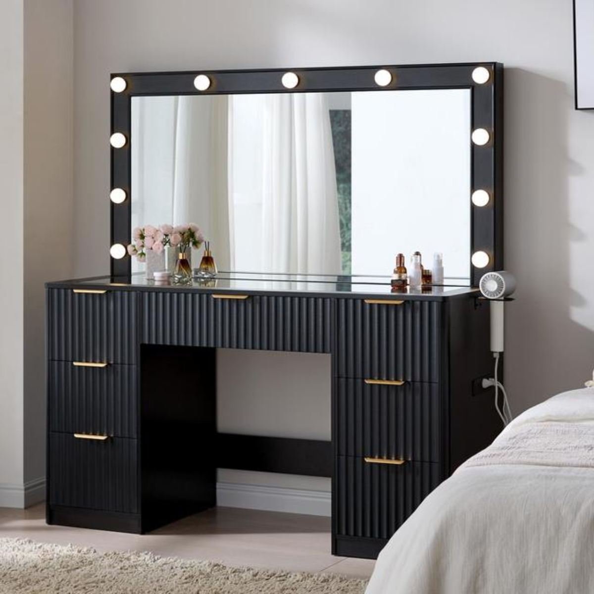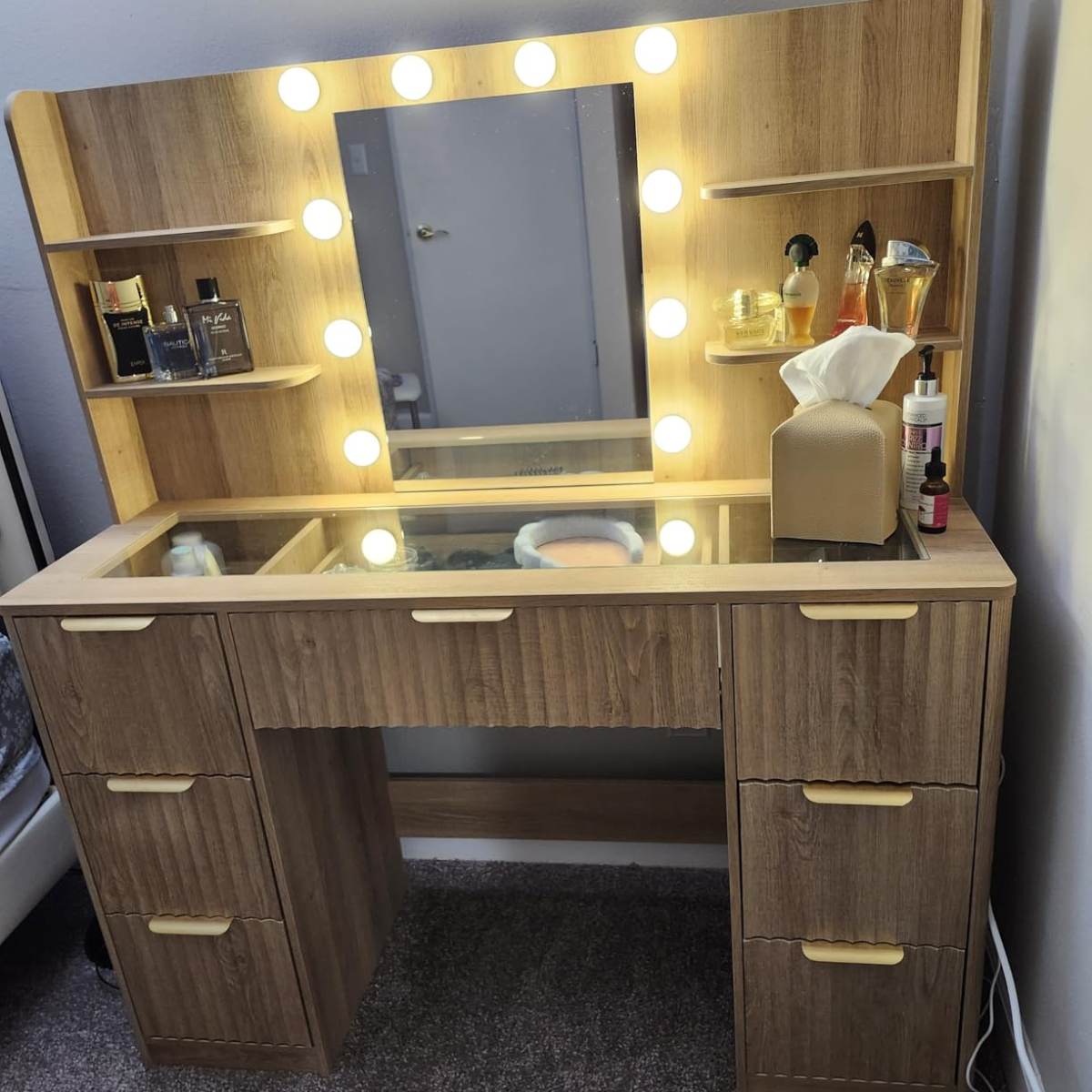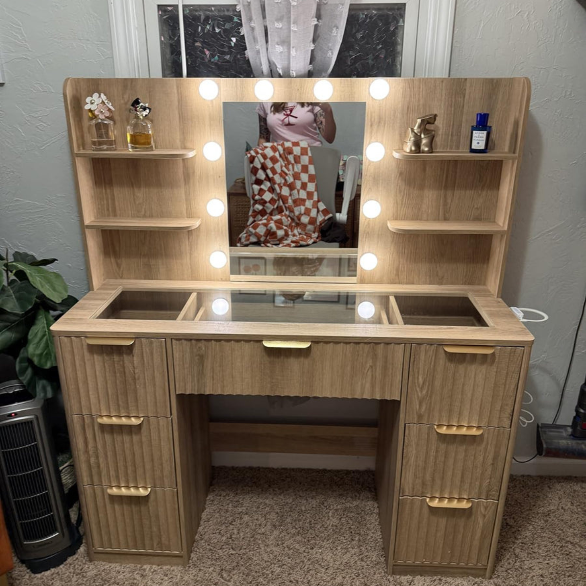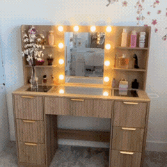 Este GlowDek transforma cualquier rincón en un espacio de belleza impecable. Las luces LED enmarcan el espejo con un brillo uniforme que realza cada detalle, mientras los estantes laterales y el tablero de vidrio te permiten ver y acceder a tus productos sin desorden.