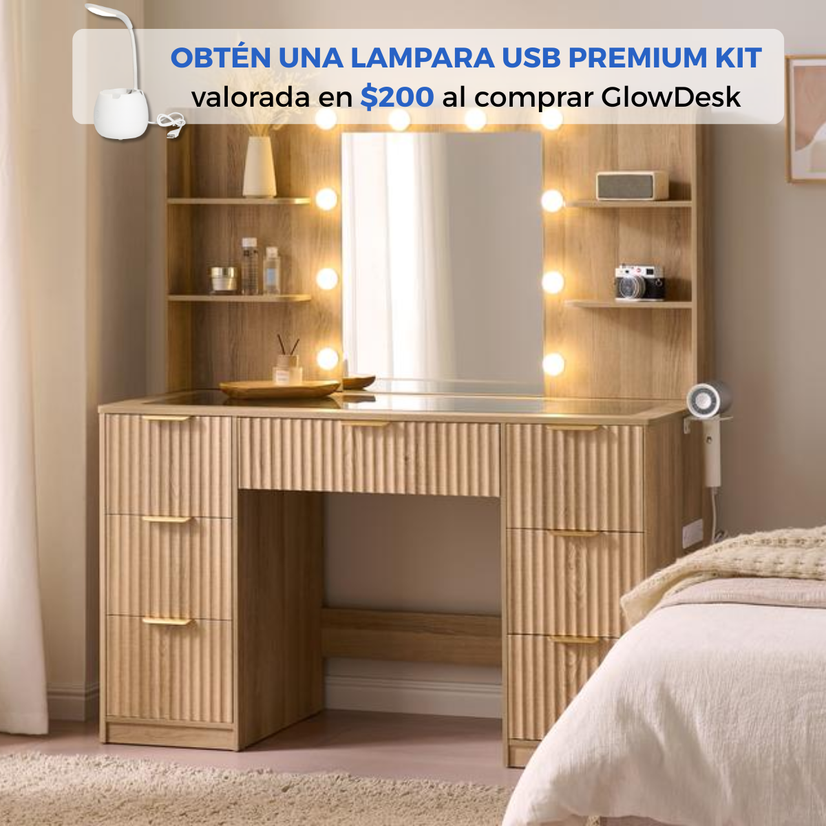 Eleva aún más tu experiencia GlowDesk™: por la compra de tu tocador, te obsequiamos esta mini lámpara LED USB, ideal para iluminar detalles, estudiar, organizar accesorios o usar como luz ambiental suave.